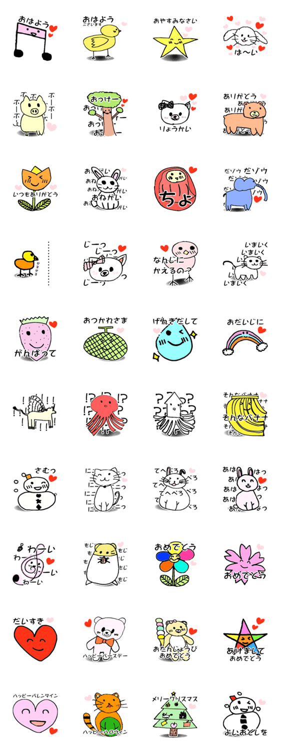 かわいいやさしいスタンプたちがメッセージを彩ります。ありがとうや好きを伝えたいとき、お誕生日・お正月・バレンタイン・ハロウィン・クリスマス・年末年始に。