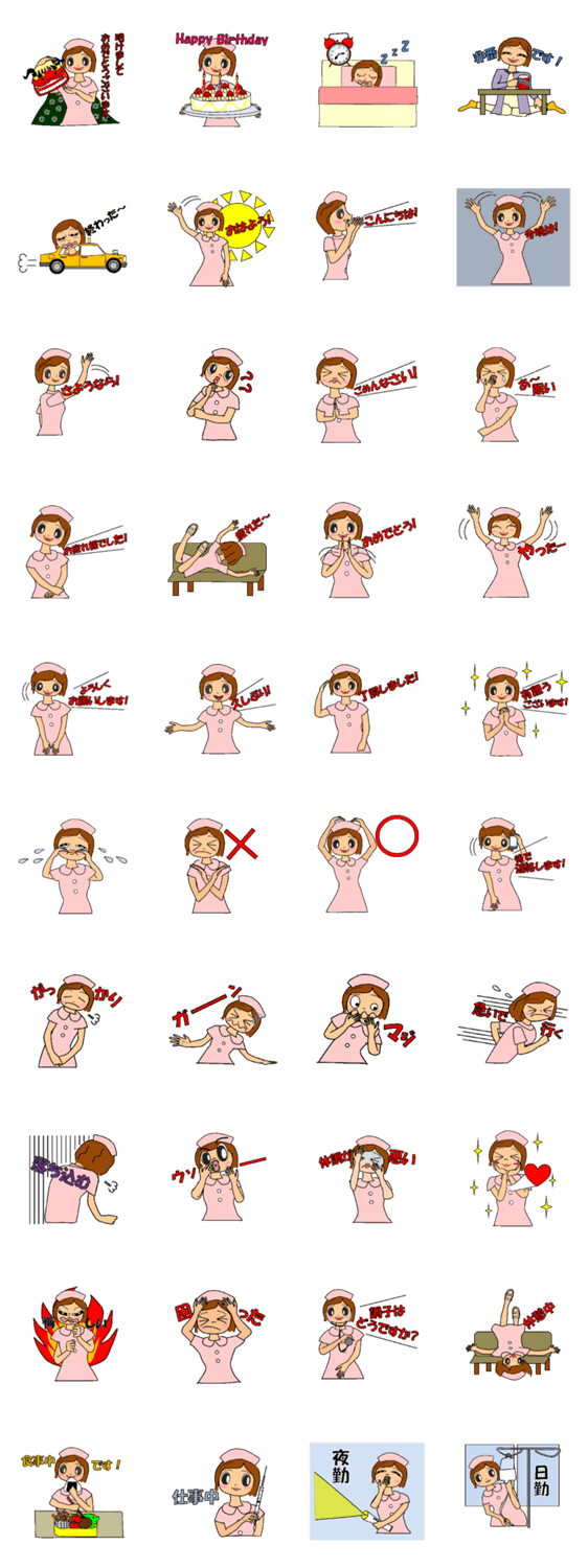 看護師(看護婦)さんの気持ちを届けるお手伝いをします。身近な人や大切な人に、お正月や誕生日などにも使えるナースのスタンプです。