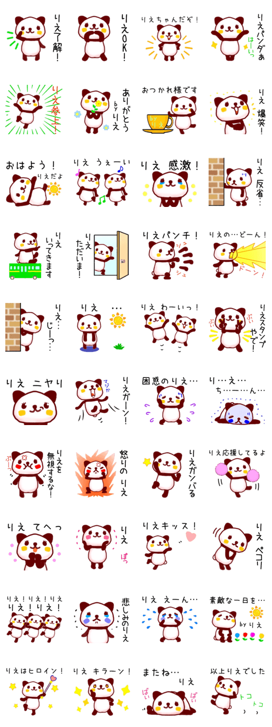 パンダのリエさんスタンプです。理恵さん、梨絵さん、里恵さん。まだまだ沢山のリエさんへ。是非、使ってみて下さい。よろしくお願いします。