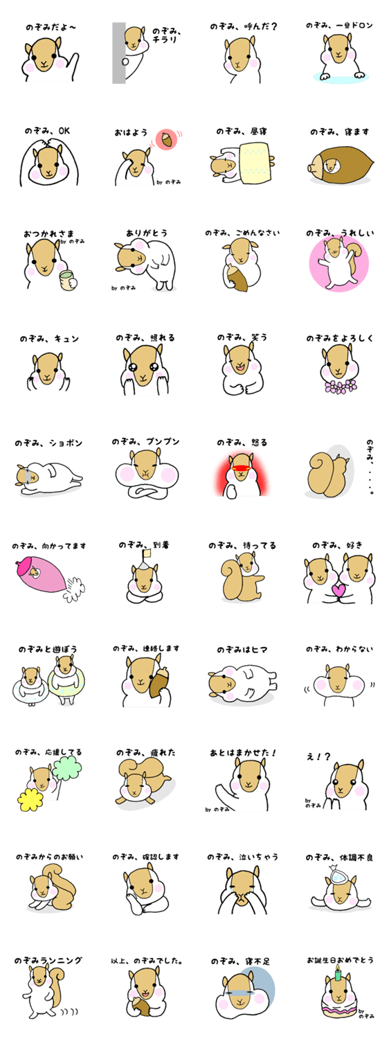 のぞみちゃん、のぞみさん、のぞみ用のスタンプです。リスが想いを伝えます。