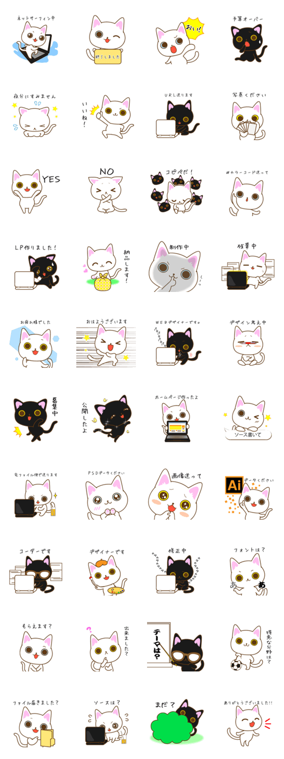 WEB語を話す猫のスタンプ。表情豊かな可愛らしい猫が業界の日常的な言葉で癒します!クリエイターにおススメです。