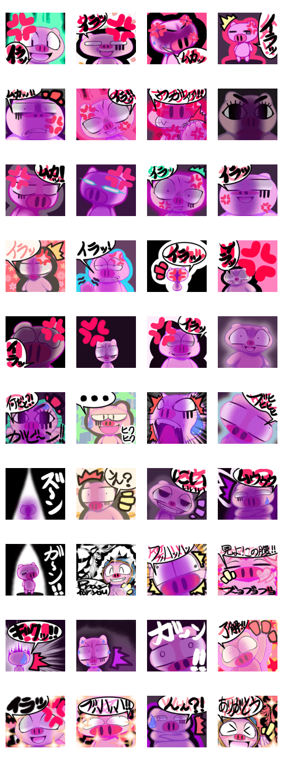 豚のマンガ風なスタンプです。イライラしてる顔のものが多めです。 カワイイのや面白いのもあります。