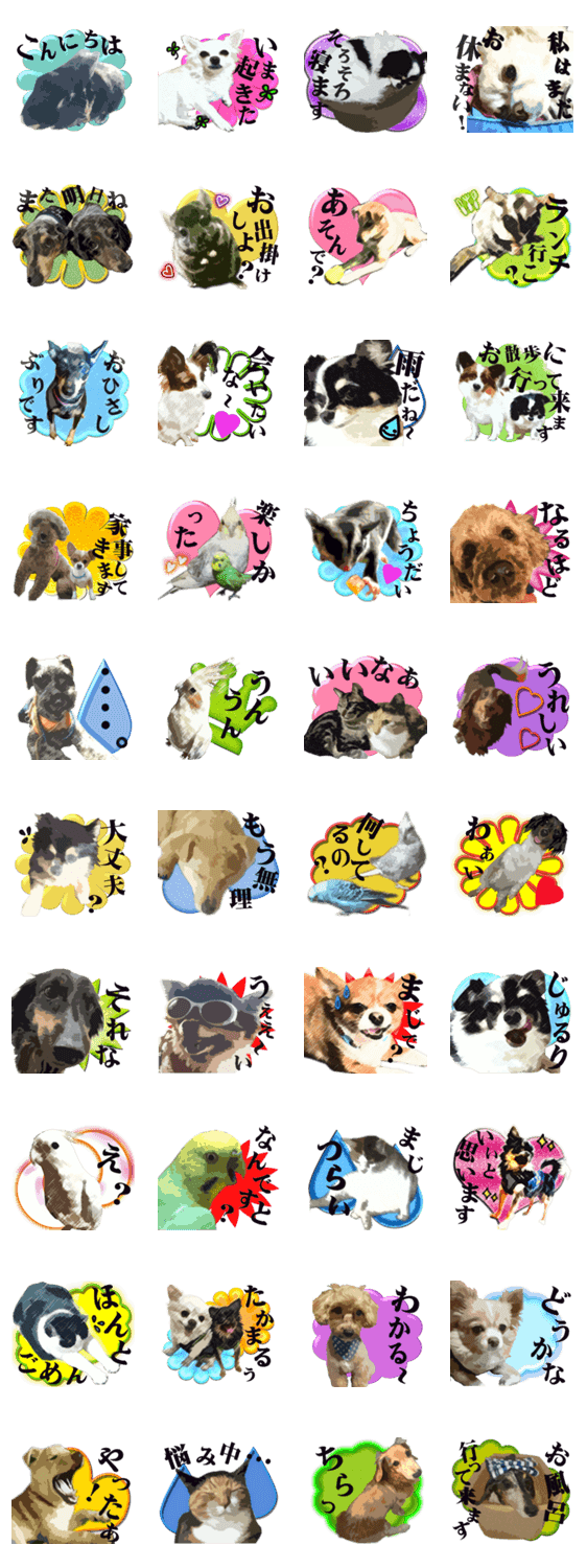 日常で良く使う言葉集めました。チワワ、ダックス、パピヨン、モモンガ、インコ、柴犬、ミニピン、トイプー、猫等、色んな動物が楽しめます。
