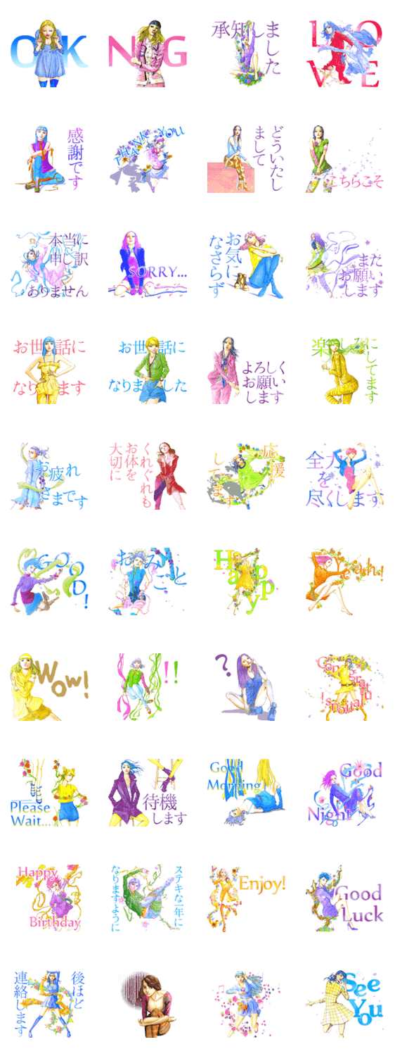 よく使う言葉を集めたクールビューティーなスタンプです。オシャレにキメたい時にお使いください。