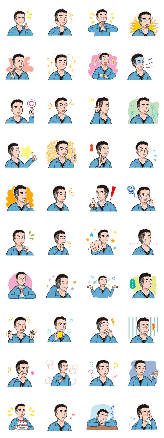 最近流行の震災刈りをした爽やかな男性です。 笑顔で相槌をうつイラストが多めなので、いつでも使いやすいスタンプです。
