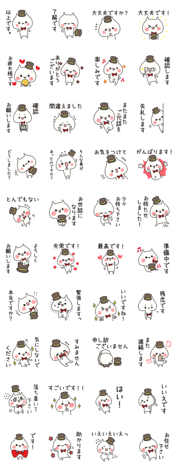 ハットをかぶって蝶ネクタイの猫(ネコ)のスタンプです。敬語での会話のスタンプになっています。