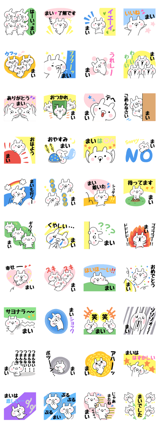名前に「まい」が付く人専用。まいちゃんスタンプです。挨拶など使いやすい言葉を多めにしてみました。友達、彼氏、家族に使えます。