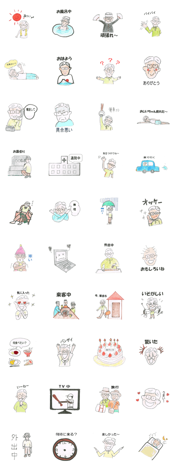 おじいちゃんはスマホに慣れていません。でも、このスタンプがあればlineでやりとりができるんじゃないかな。そんな願いを込めて作りました。