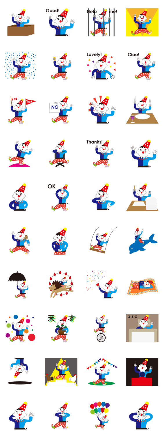 ピエロHがスタンプに初登場です。楽しい公演をあなたの会話にどうぞ。時々は、動物の友達も一緒にパフォーマンスを披露します。