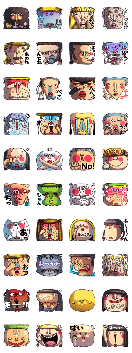 どアップな顔で簡単な返事をするスタンプです。40キャラで1セットになっており、キャラかぶりはございません。★どアップシリーズ5作目★