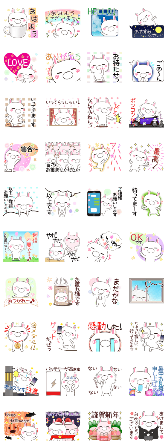 糸目のゆるいウサギのスタンプです。友達用と目上の方用の敬語を全体の半々ぐらいの他、暑中お見舞い,クリスマス,ハロウィン,年賀状等の挨拶等も入れてます。