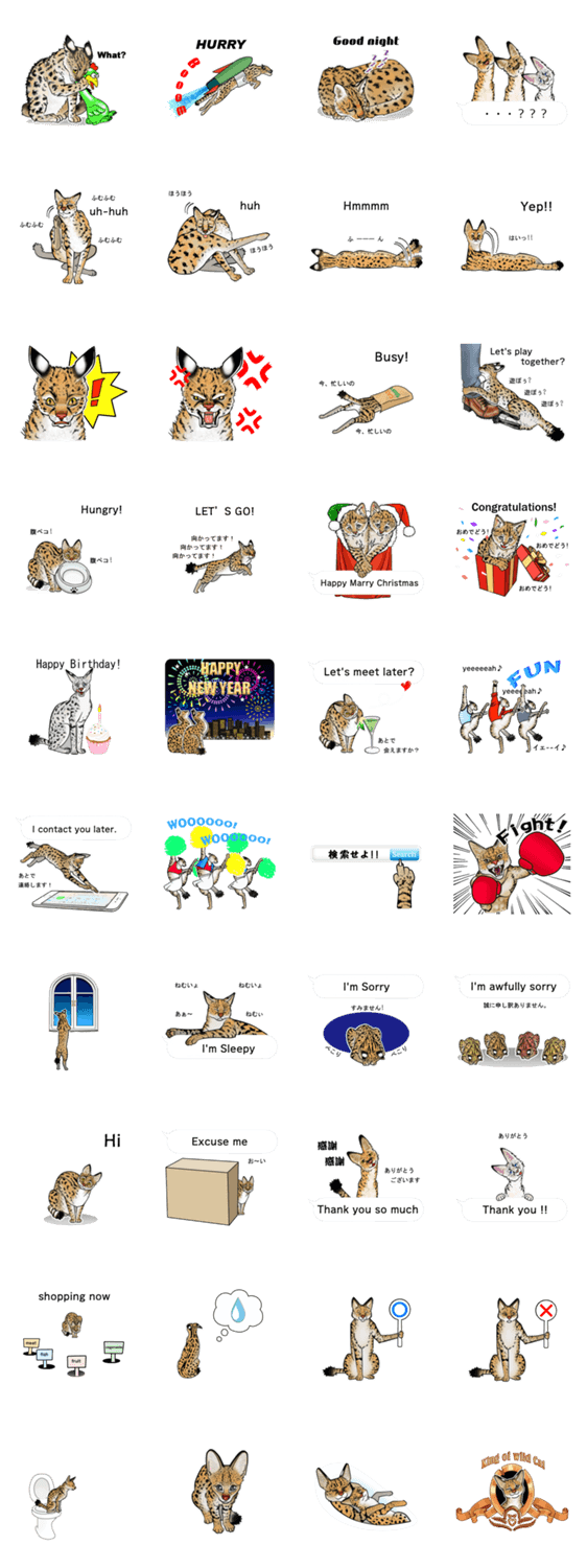 サーバルキャットをキュートなスタンプにしました。英語と日本語で語りかけます。