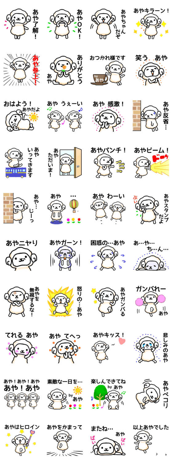 ヒツジのアヤさんスタンプです。綾さん、彩乃さん、亜矢子さん、彩子さん、まだまだ沢山のあやさんへ、是非使ってみて下さい。よろしくお願いします。