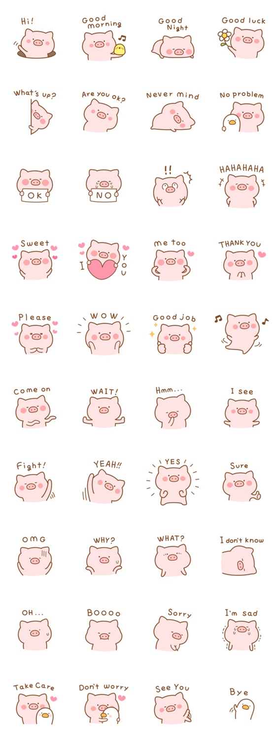 つぶらな瞳で語りかけるこぶた「ぶたたん」の英語のスタンプです。