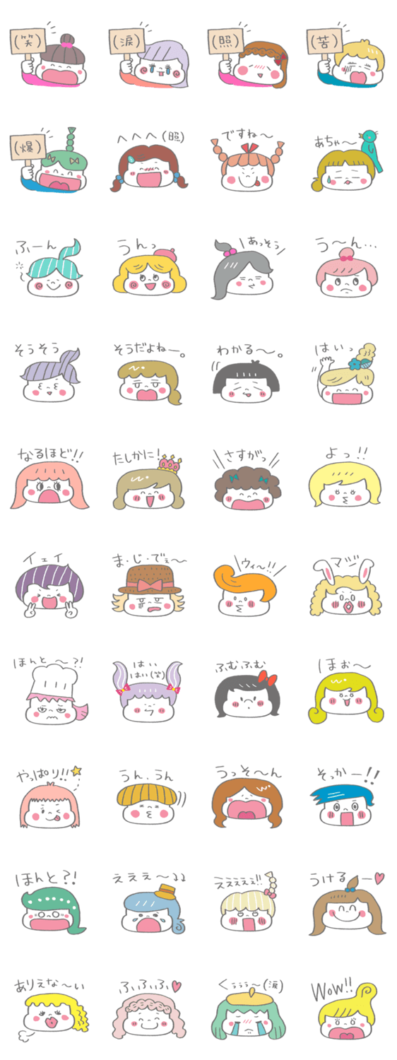 40人のかわいい奴らが大集合!!表情豊かにあいづちしてます。女の子が使ってて楽しくなるようなカラフルPOPなスタンプです♪