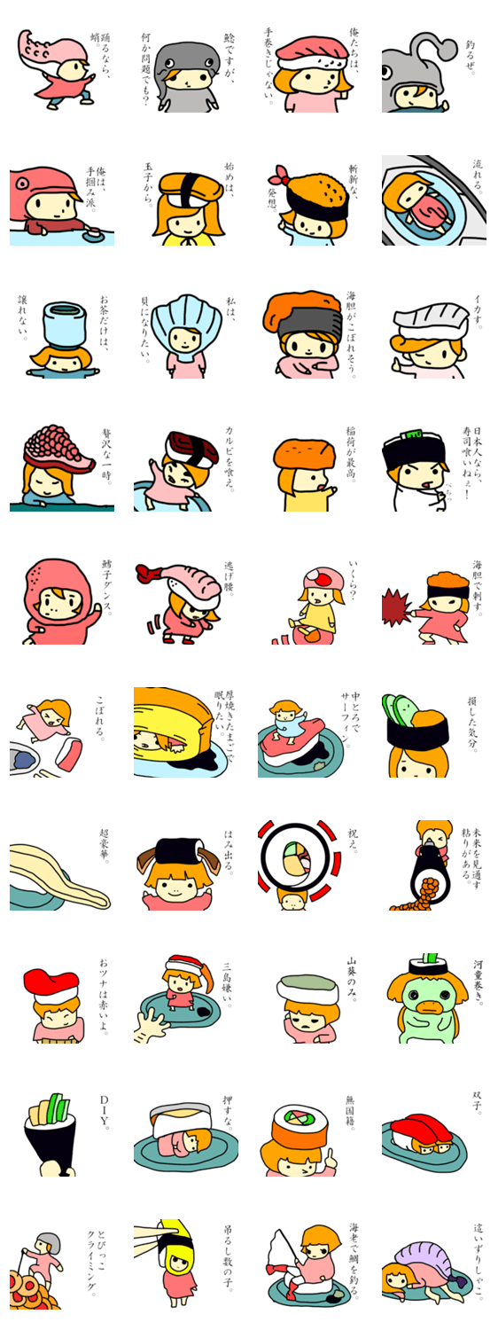 寿司の被り物をした小僧たちの姿の漂流の姿を作りました。セリフは使いづらいかも。