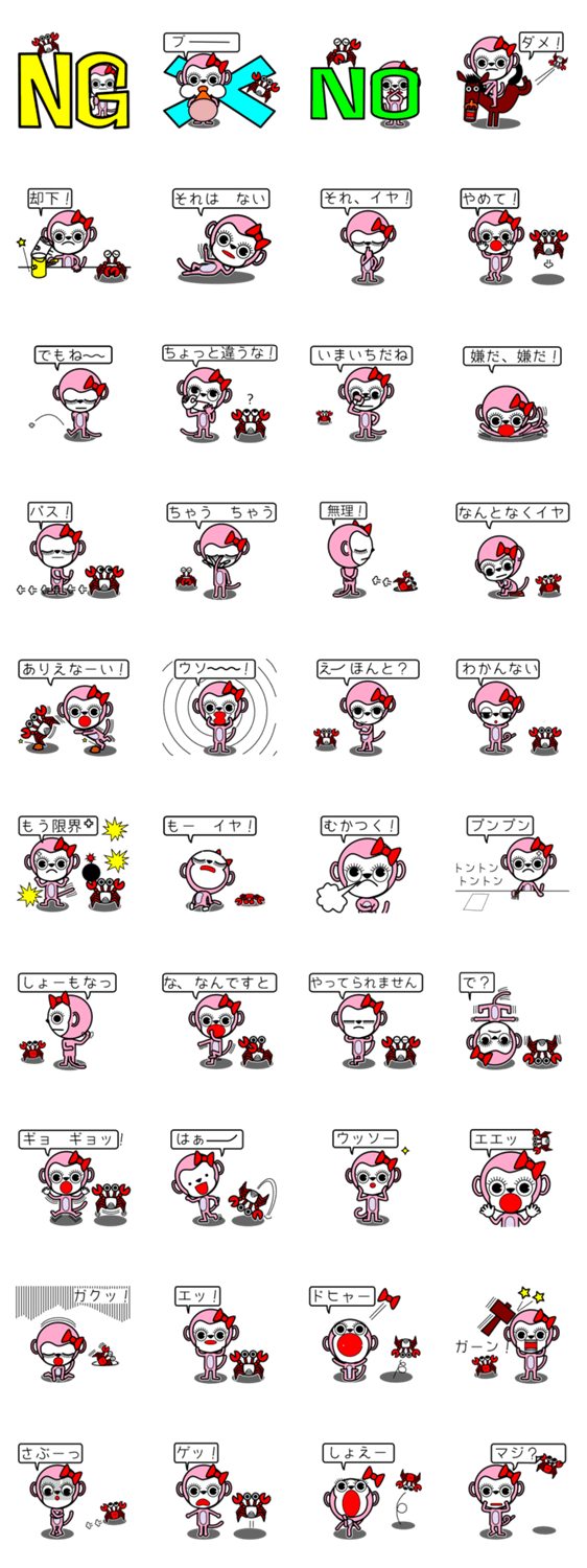 コザルちゃんは可愛い小さな女の子の猿です。今回は、否定的な返事と驚きについてのスタンプです。"コザルちゃんのお返事1"とセットで使ってね。
