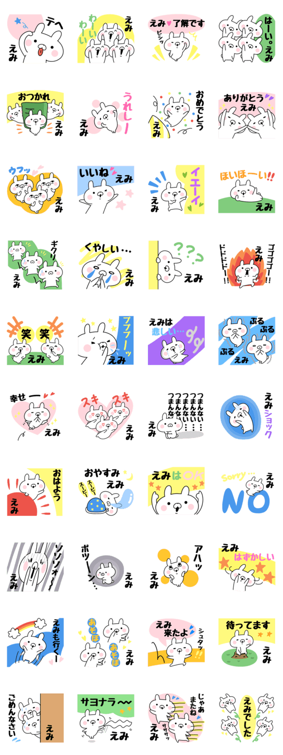 名前に「えみ」が付く人専用。えみちゃんスタンプです。挨拶など使いやすい言葉を多めにしてみました。友達、彼氏、家族に使えます。
