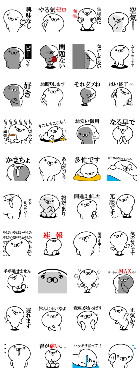 アザラシのようなアイツが発する言葉としぐさの違いに惑わされそうになるスタンプです。