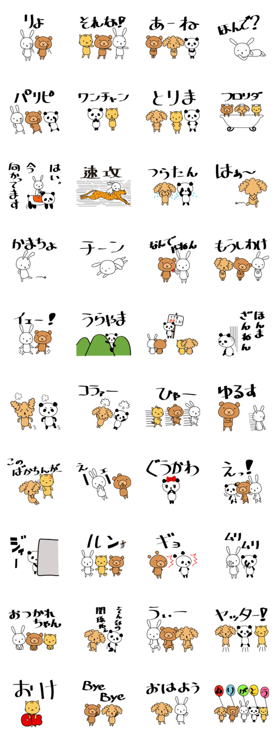 ゆるい動物達。うさぎ・クマ・パンダ・いぬ・ねこが自由に行動しおしゃべりします。