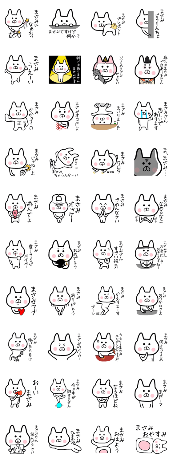 マサミさんのための名前スタンプです。本人や、雅美、昌美、正美、正巳、雅巳さんに使って下さい。それ以外にも関係ない人に送っても許してくれる優しい人に送って下さい。
