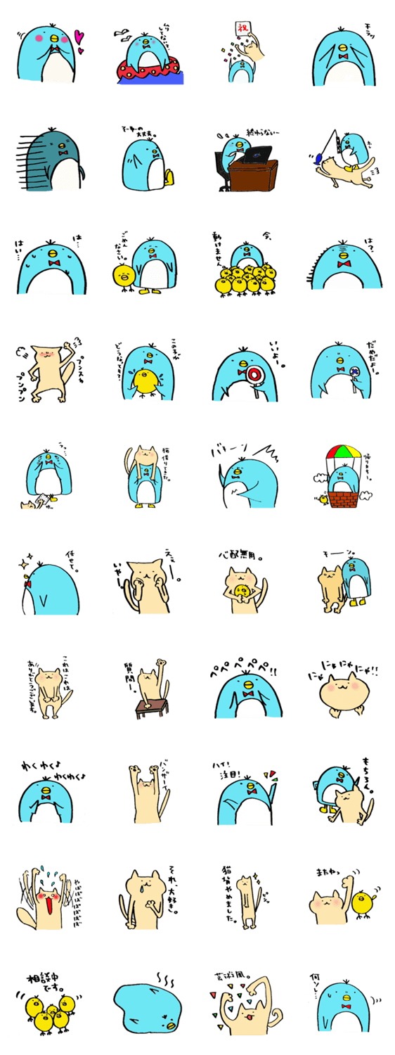 ぺんぎんのぺぺ・ネコのにゃにゃ・ひよこのぴぴ3匹の微笑ましい?日常スタンプです。