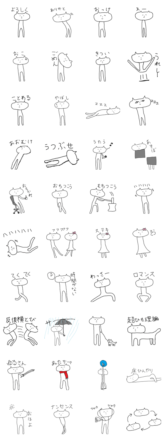 アリマヒロキのスタンプ第二弾は足の長い猫です。ゆるいスタンプでゆるくいきましょう。