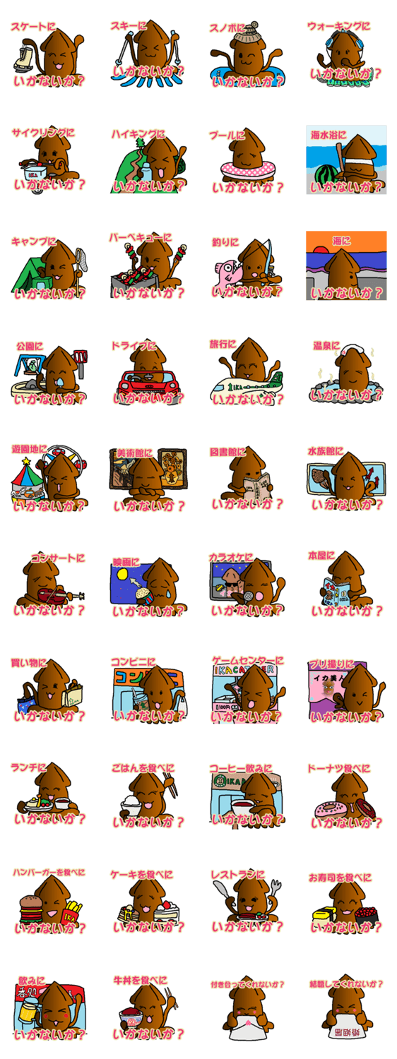 イカのスタンプです!「イカ」と「いかないか」をダジャレ風にし、友達や恋人を気軽に遊びやデートにお誘いする為のスタンプです!告白や求婚はよ~く考えて使ってねww