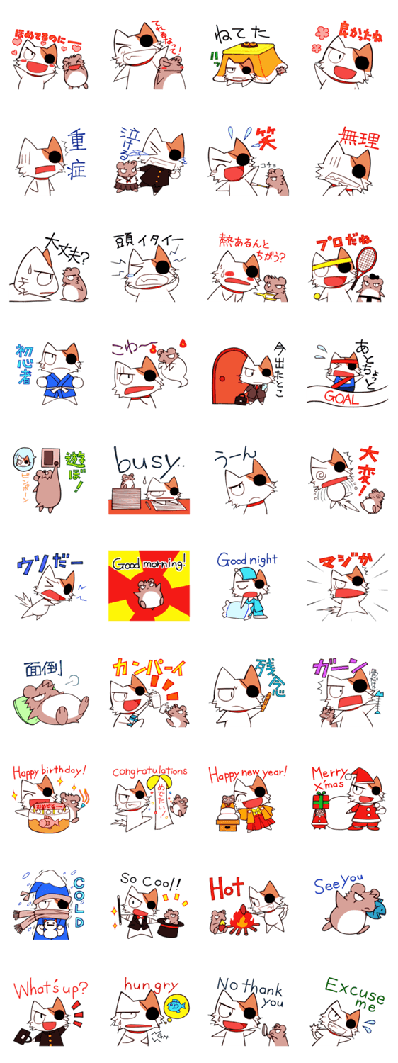 眼帯猫とハムスターの絵柄のスタンプ第2弾です。今回は毎日使いそうな言葉を増やしてみました。