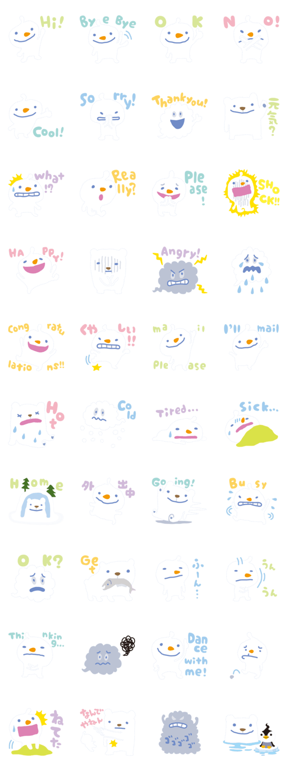 雪の精「ゆきち」のスタンプ。 友だちの「クマジロー」と「くももん」もいるよ。
