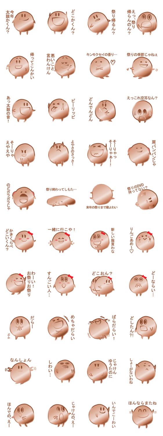 住友別子銅山のおひざ元、愛媛県は新居浜。新居浜と言えば、四国三大祭りの一つ、新居浜太鼓祭り!太鼓台が大好きな銅のどう君が新居浜弁を喋るスタンプです。