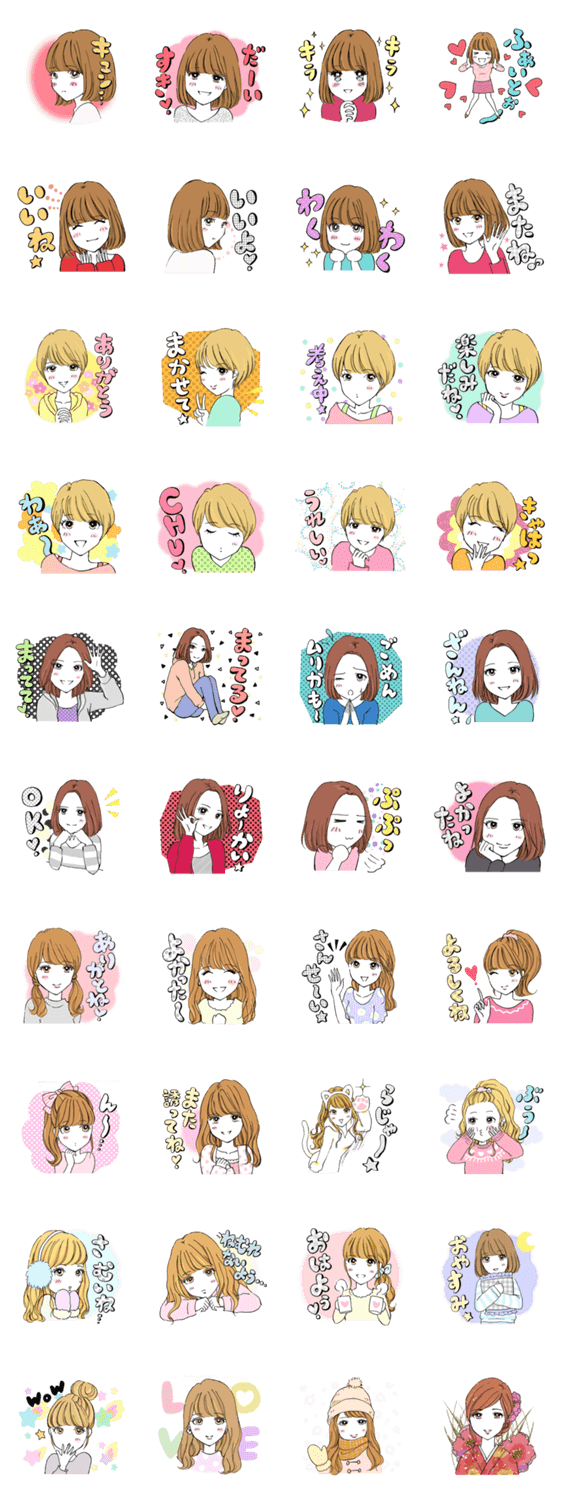 雑誌で数々のモテ子を描いてきたイラストレーター滝永Saruriのモテ子スタンプ第2弾!第1弾になかった「嬉しい」などの鉄板リアクションや、ショートヘアーのモテ子も登場♪