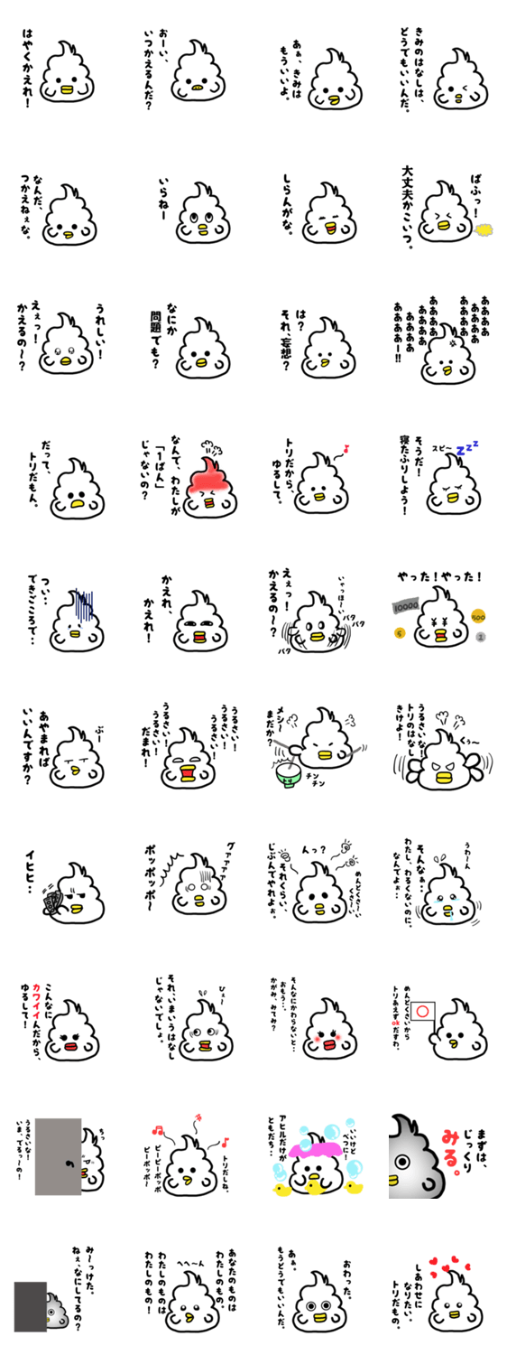 少し性格の悪いトリのスタンプです。 おもちゃのアヒルだけが友達です。