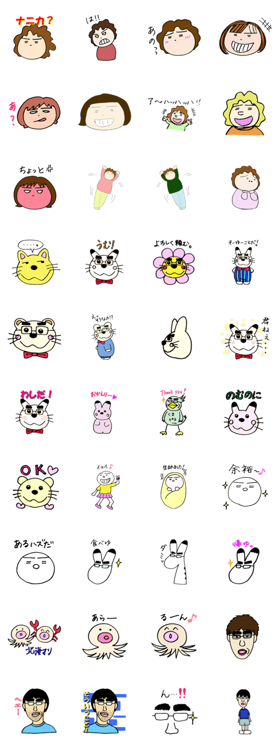 ナニカちゃんと仲間たち。会長、のりちう、ムクちゃん、ノリオなど人気者がスタンプに登場!「一番人気は、わしだなぁ・・・(会長)」