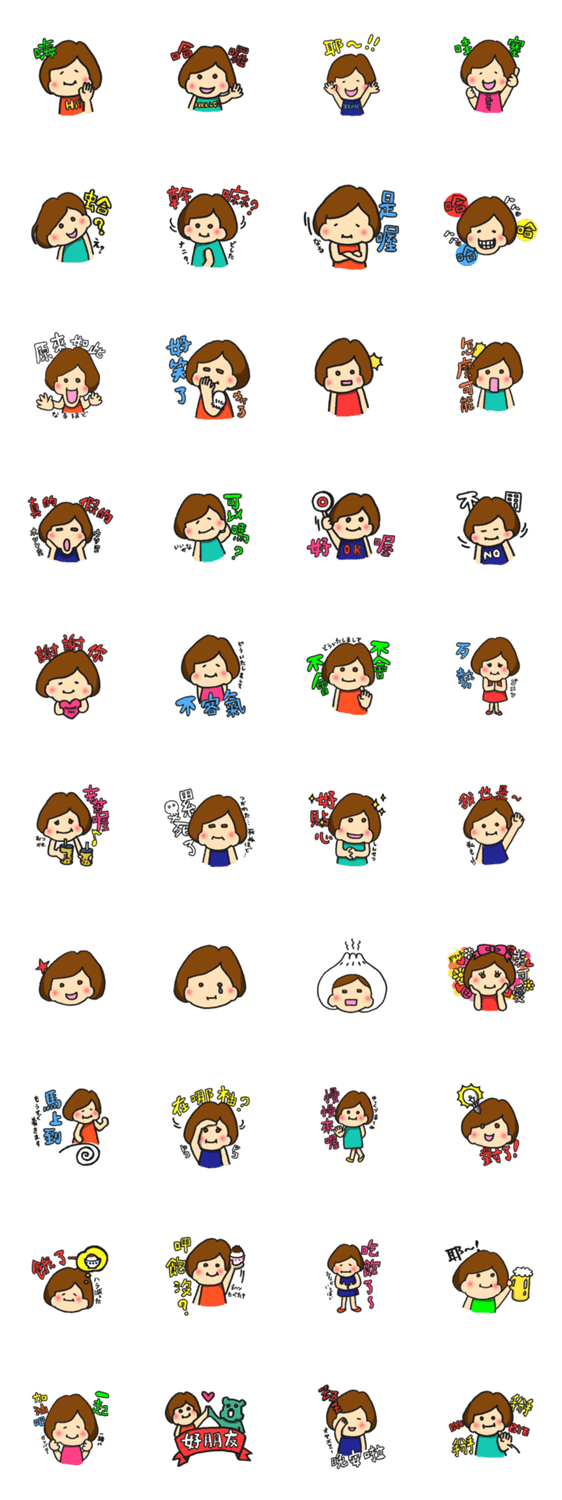 ボブヘアーの女の子のスタンプです。台湾語と一部日本語との併記です。