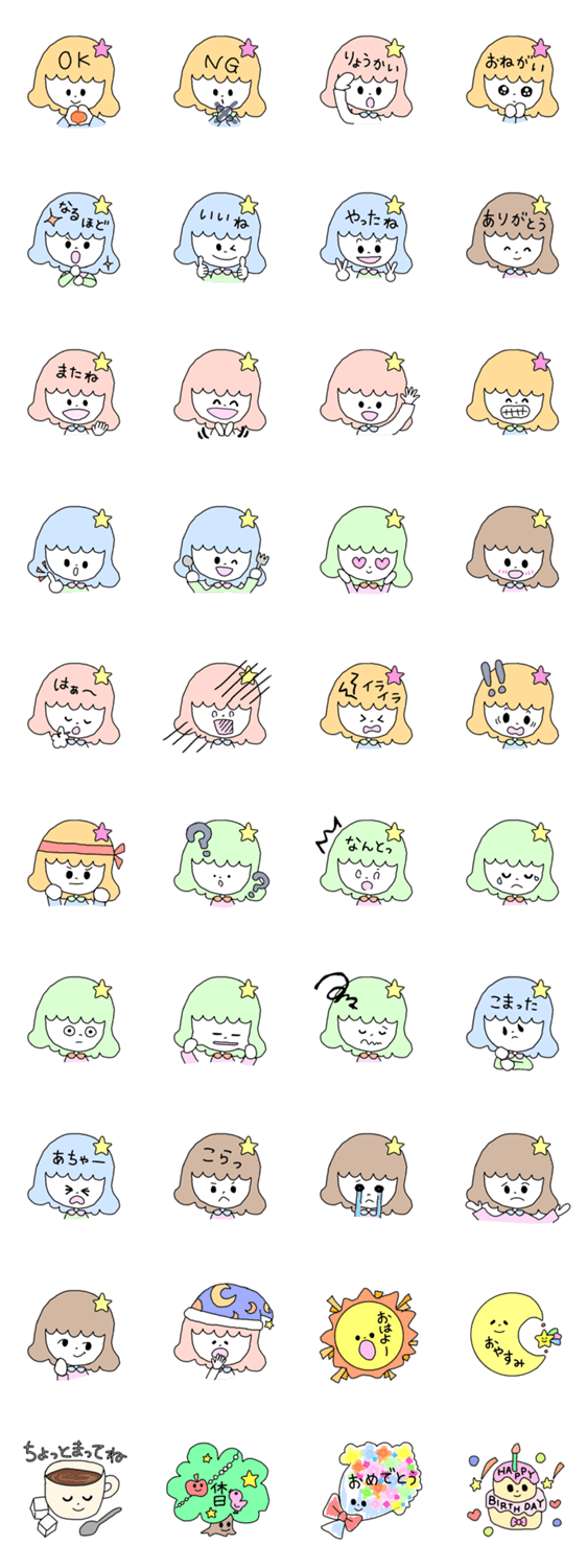 色んな表情がたんさん詰まった可愛いスタンプです。パステルカラーで優しくフワッとした女の子らしいスタンプです。