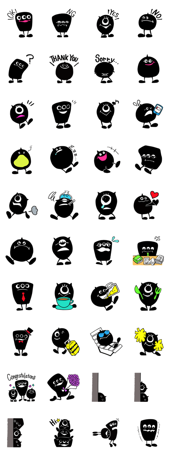 影にひそむ黒いモンスター達のシンプルなスタンプです。 彼らは物陰に潜みながら、時々あなたを助けたり、からかったりするかも・・・?!