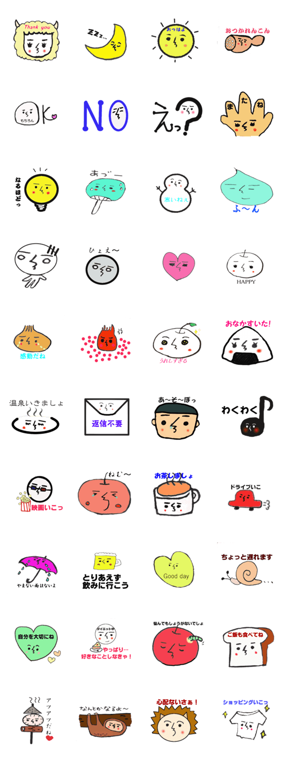 鼻と口がつながったキャラクターが、いろいろなものに人面化。 誰かを誘いたいとき、誰かを励ましたいときに活躍するスタンプたちです。