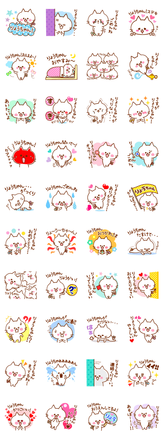 りょうすけ、りょうた、りょうたろう、りょういち、りょうが、りょうこ‥‥などの「りょうちゃん」に送る、ねこのキャラクターのあだ名・名前スタンプです。