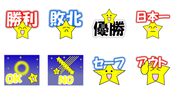 星のスタンプです。 勝利/敗北/優勝/日本一/OK/NO/セーフ/アウトのスタンプがあります