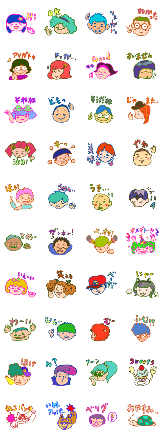 全部ちがう子供たちのカラフルなスタンプです。日常のあいさつで使えます。