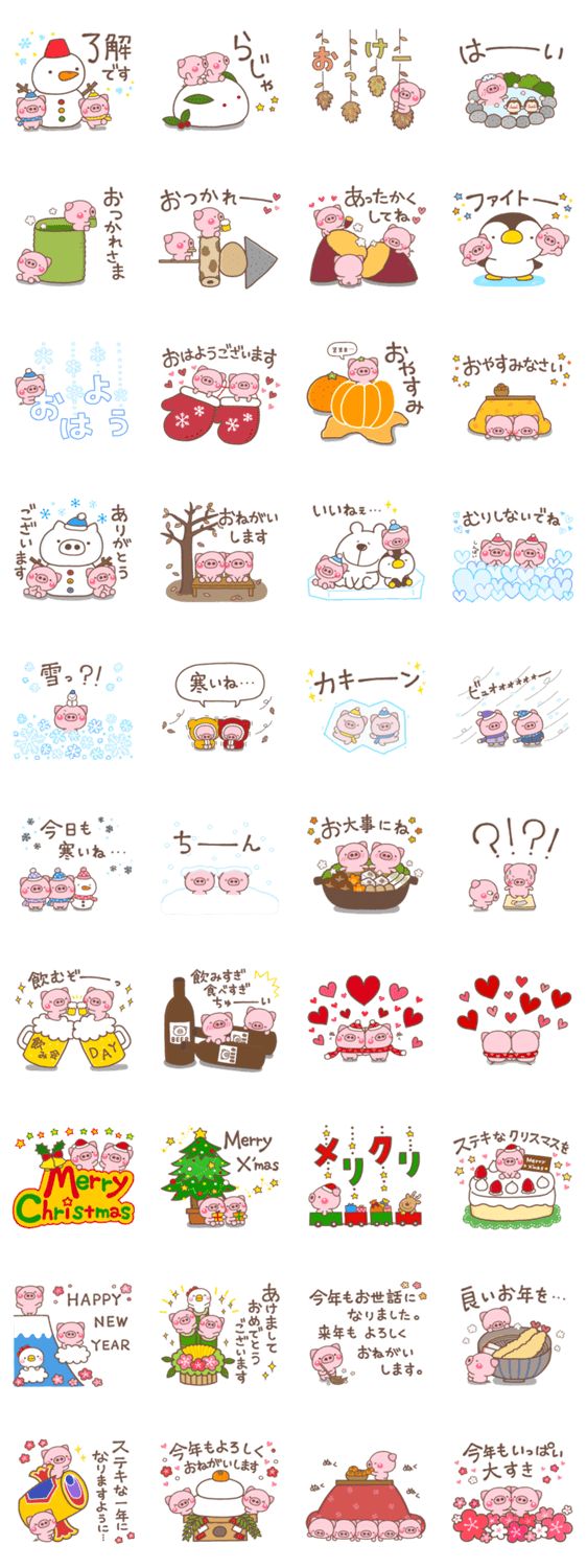 冬にぴったりなスタンプを全部集めました。毎年使える通年verのクリスマス・年賀スタンプもあります。今年の冬はぶたさんに決まり♪【作:いしいともこ】