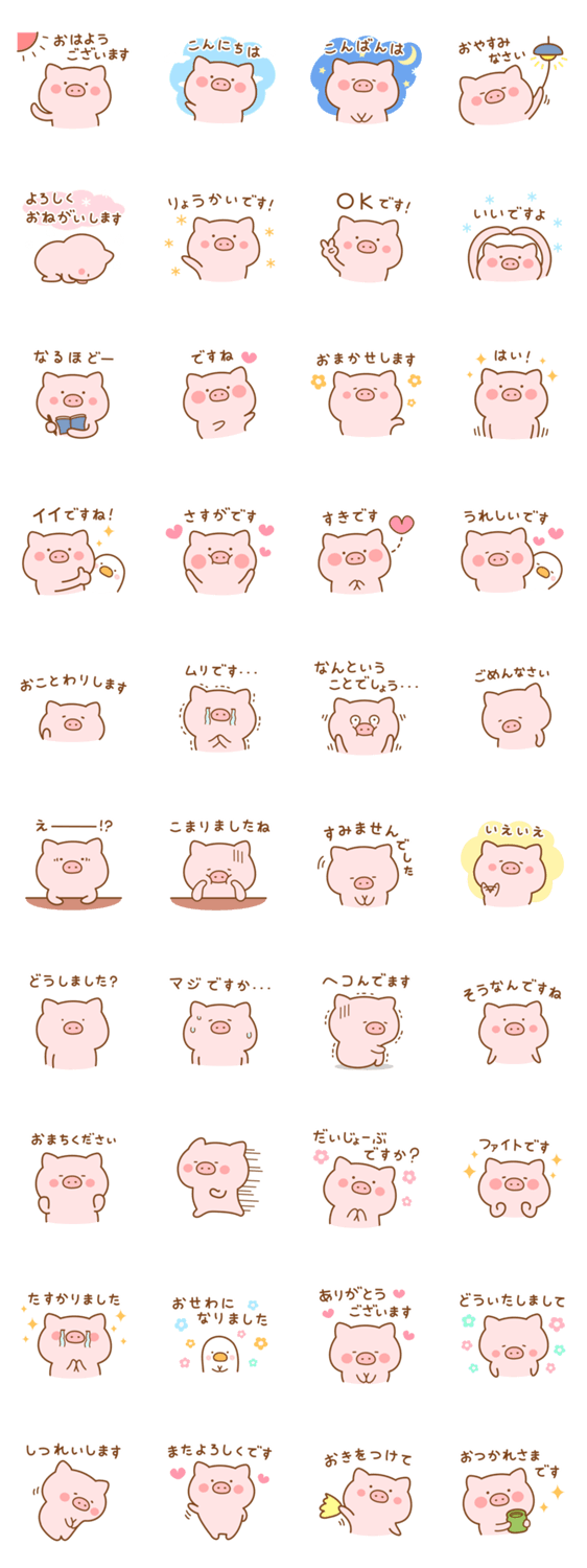 つぶらな瞳で語りかけるこぶた「ぶたたん」の敬語のスタンプです。丁寧な言葉使いのスタンプで返信できます。