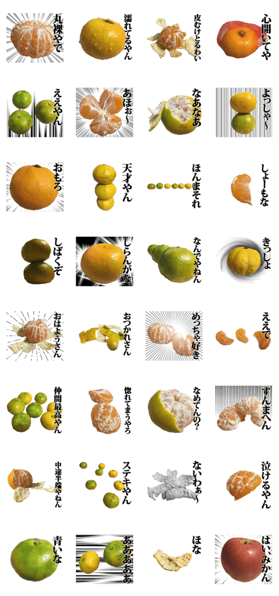 とにかく違和感とシュールの塊なので、送った相手から「なにこれ?超うける」と言われたいときに使ってください!みかんです。関西弁、大阪弁なので使いやすくて便利です!