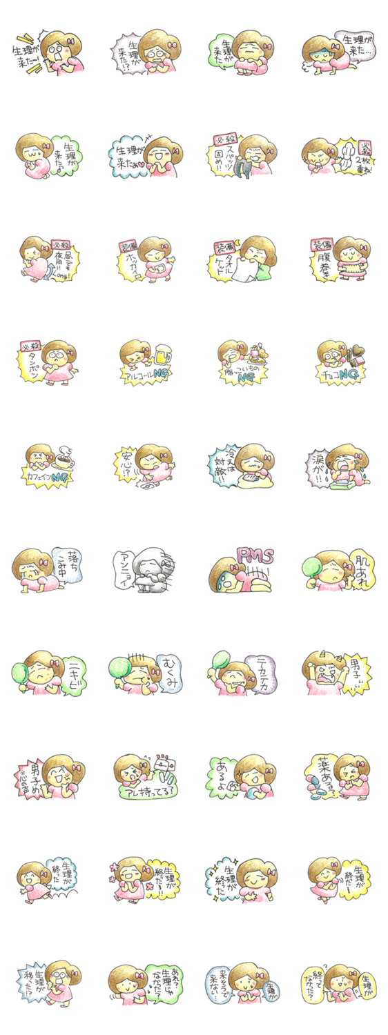 生理あるあるスタンプPart2!生理にかかわる、いろんなシーンを集めました。生理痛やPMSの他に体調不良の時にも使えます。