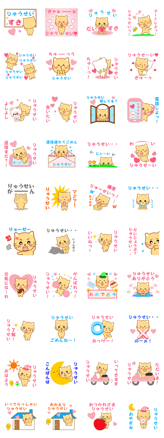 大好きな「りゅうせい」に送るためのお名前スタンプ。隆盛、流星、劉生、竜生などへ♡カップル・彼氏と彼女・友達、家族でどうぞ!りゅうせいが使うこともできます。