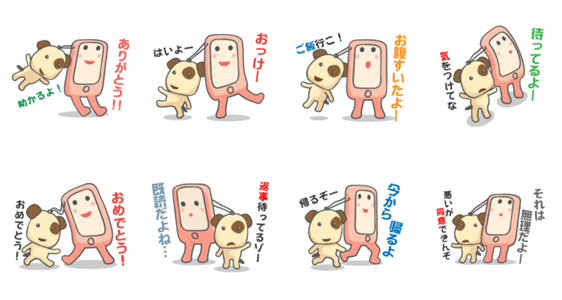 スマートフォンのすまーふぉさんと、ストラップのブチストくんのスタンプ第2弾。いつも一緒の仲良しコンビが、あなたの気持ちを2倍にして伝えます。