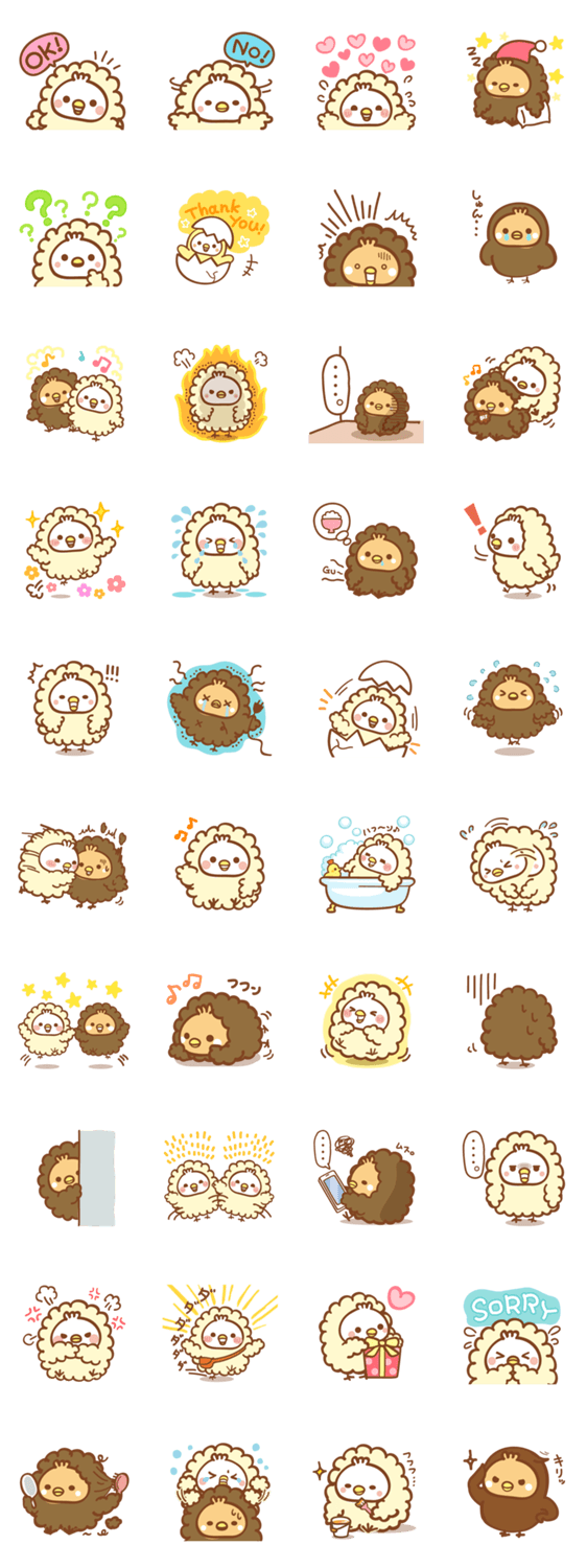 生まれつき天然パーマの『もじゃこ』と、ひょんなことから感電でパーマになってしまった『こげもじゃこ』のコトリのスタンプです。