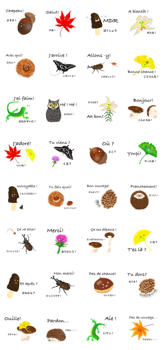 森の中で、ユーモラスな仲間たちがおしゃべりしているよ。フランス語と日本語のスタンプを楽しんでね。