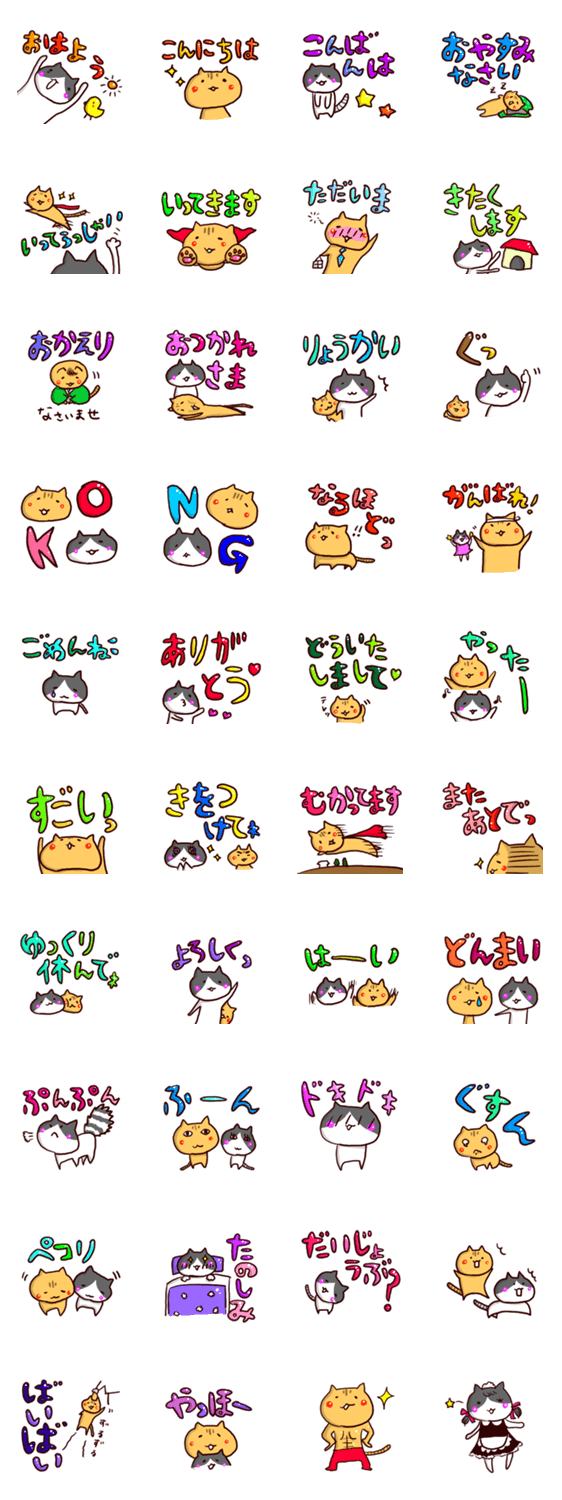 スタンプになったネコ達の生活第二弾! 使用頻度の高い挨拶やお返事系をまとめました。文字が大きくて見やすい、使いやすい!